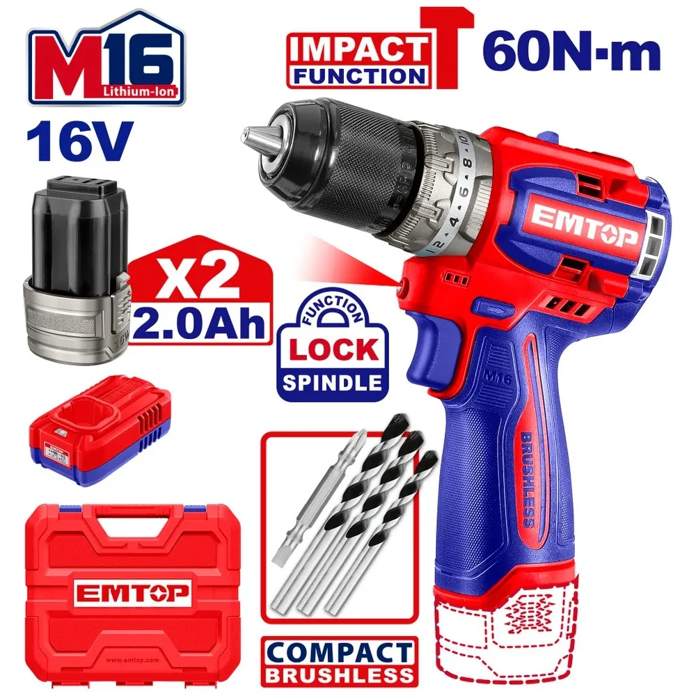 Дрель ударная бесщеточная аккумуляторная EMTOP ECIDL16682