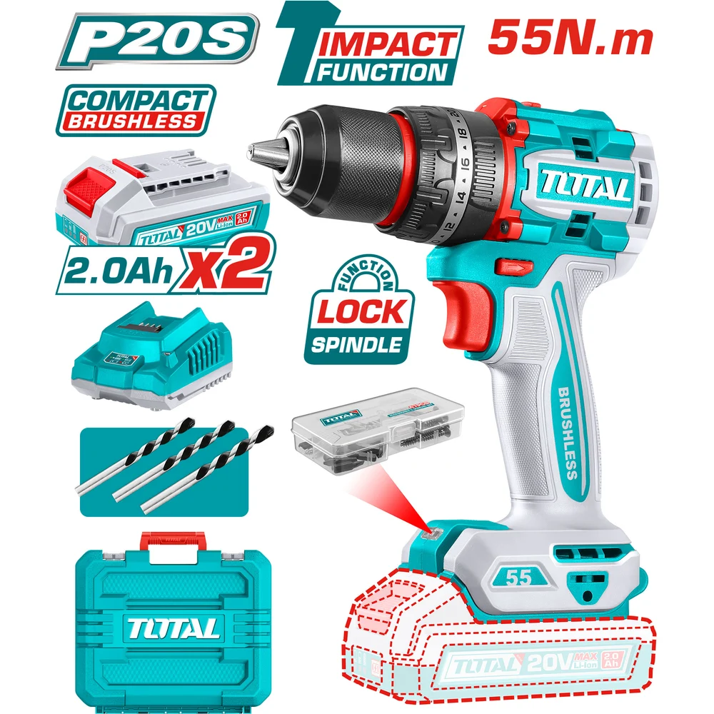 Купить Компактная Бесщеточная Аккумуляторная Ударная Дрель 20V TOTAL TIDLI20558 по лучшей цене с доставкой - интернет магазин №1 в России