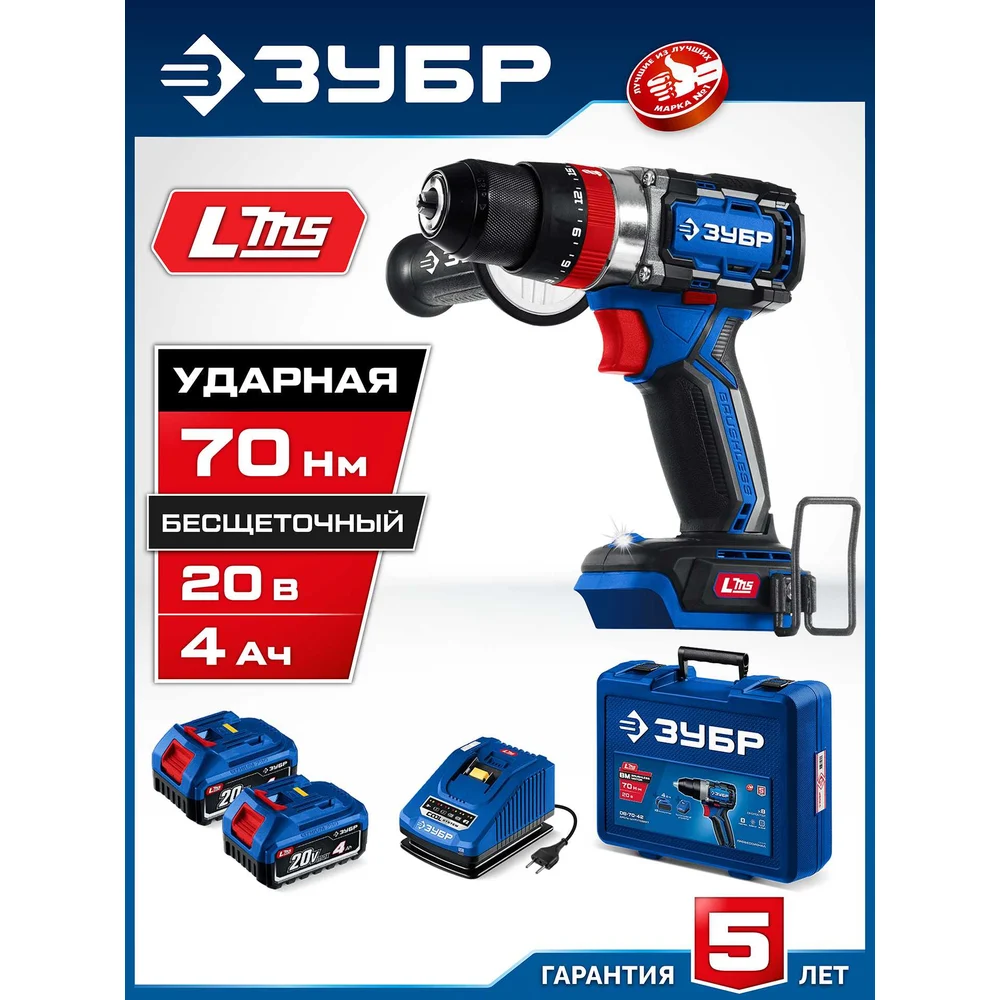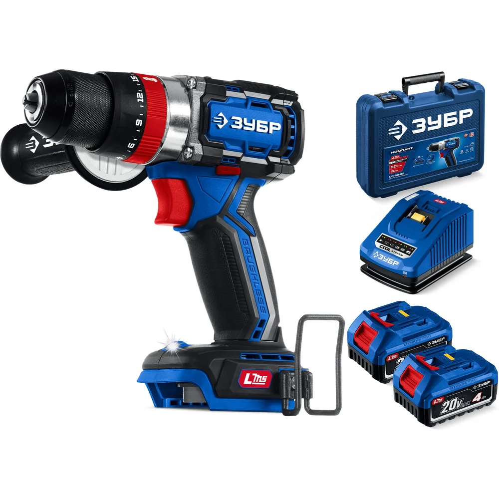 Профессионал ЗУБР 20 В, 70 Н·м, 2 АКБ LMS (4 А·ч), бесщеточная ударная дрель-шуруповерт, кейс DBS-70-42