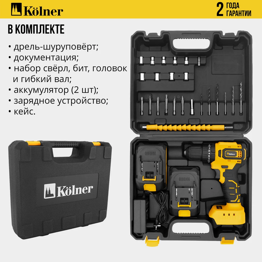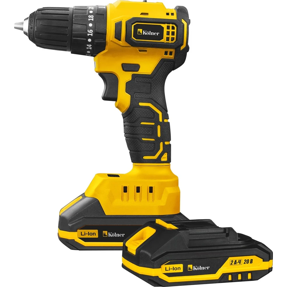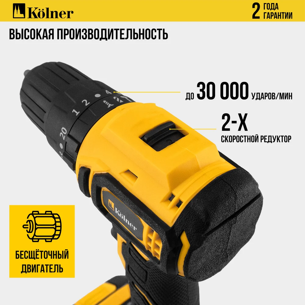 Купить Ударная аккумуляторная дрель-шуруповерт Kolner 20В, BL, 45Нм, KCD 20/2BLC, патрон БЗП 10 мм, 0-450/0-1700 об/мин (2x2.0 Ач, зу, набор инстр, кейс) 8020100543 по лучшей цене с доставкой - интернет магазин №1 в России