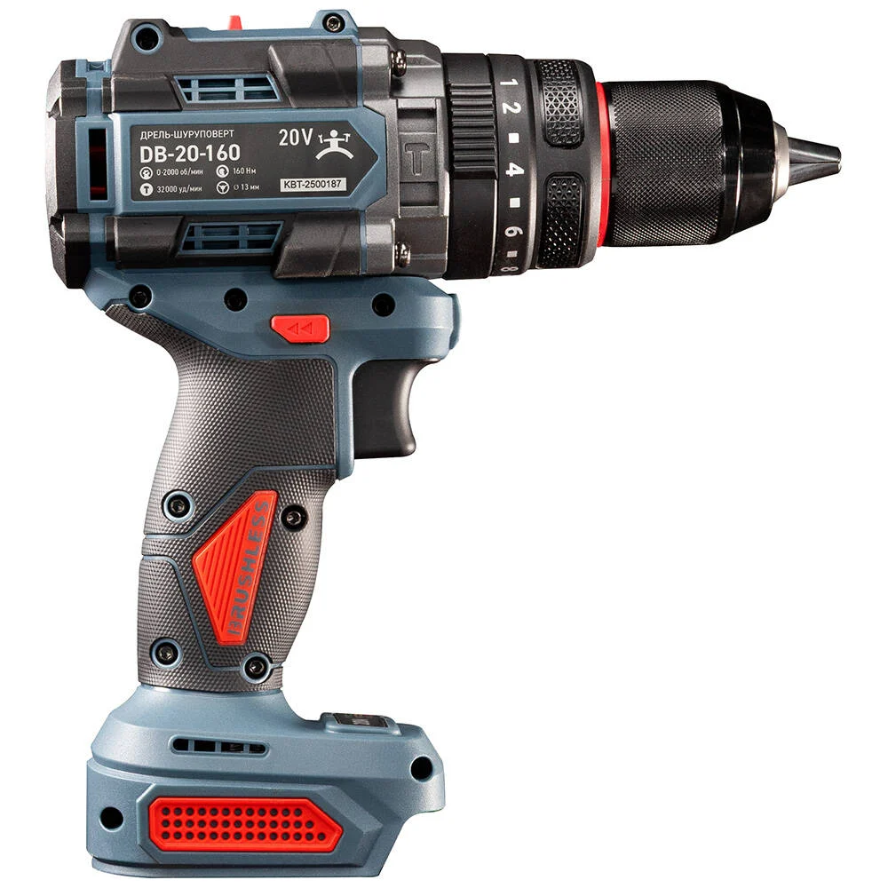 Комплектация Бесщеточная ударная дрель-шуруповерт DB-20–160; Фирменная обрезиненная рукоятка; Паспорт; Картонная коробка; Поставляется без аккумулятора и зарядного устройства