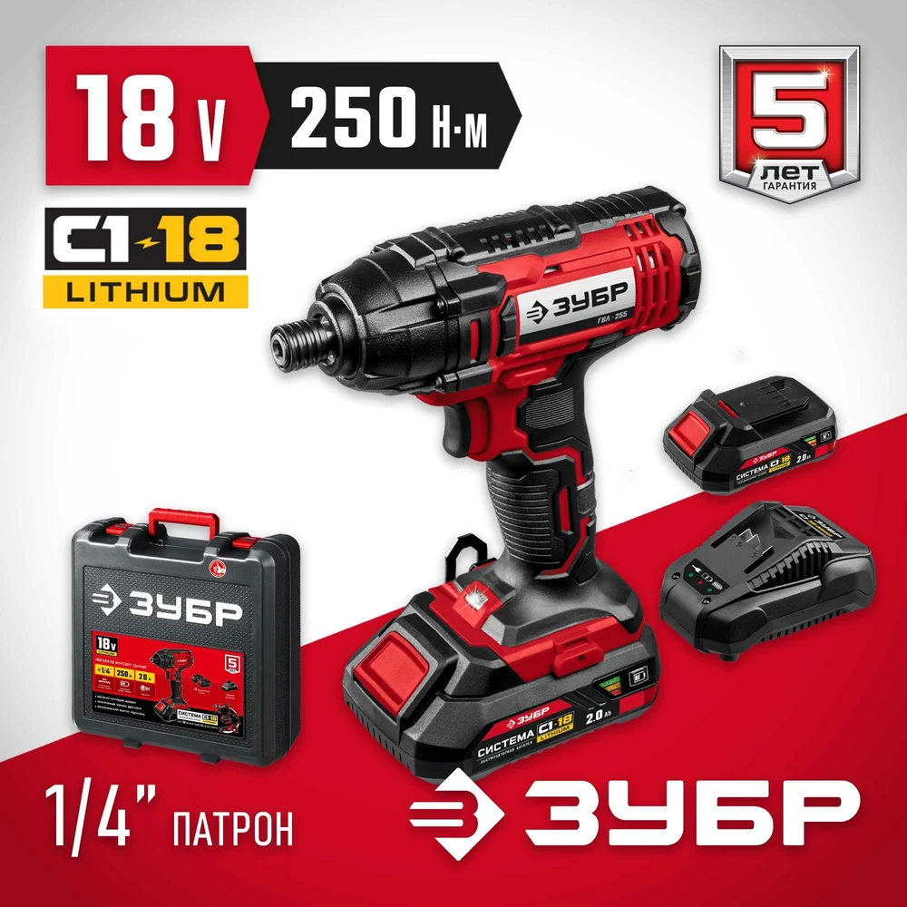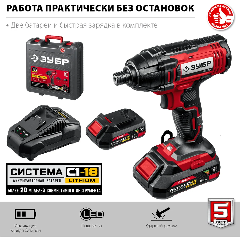 Купить Ударный винтоверт ЗУБР 18В, 2 АКБ (2Ач), в кейсе ГВЛ-255-22 по лучшей цене с доставкой - интернет магазин №1 в России