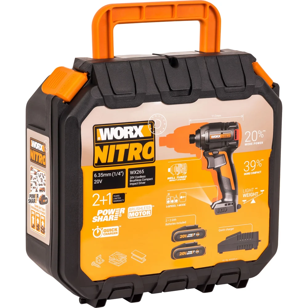 Винтоверт ударный бесщеточный аккумуляторный WORX 20В, 200Нм, 2Ач х2, ЗУ 2А, кейс WX265