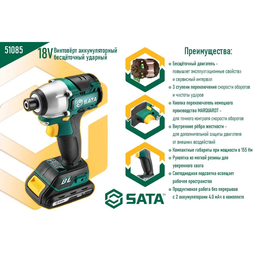 Купить Винтовёрт аккумуляторный бесщёточный ударный 18V Sata SC51085 по лучшей цене с доставкой - интернет магазин №1 в России