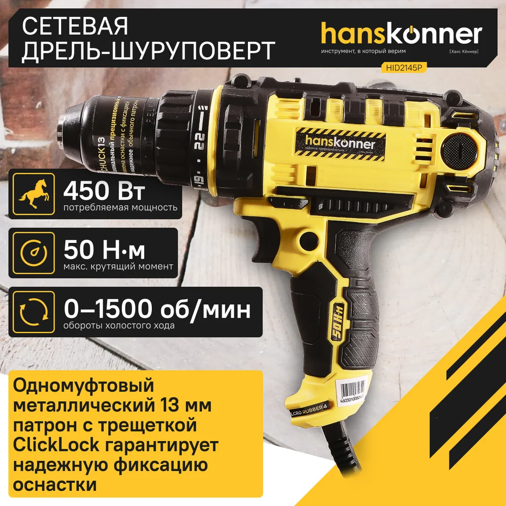 Купить Сетевая дрель-шуруповерт Hanskonner HID2145P по лучшей цене с доставкой - интернет магазин №1 в России