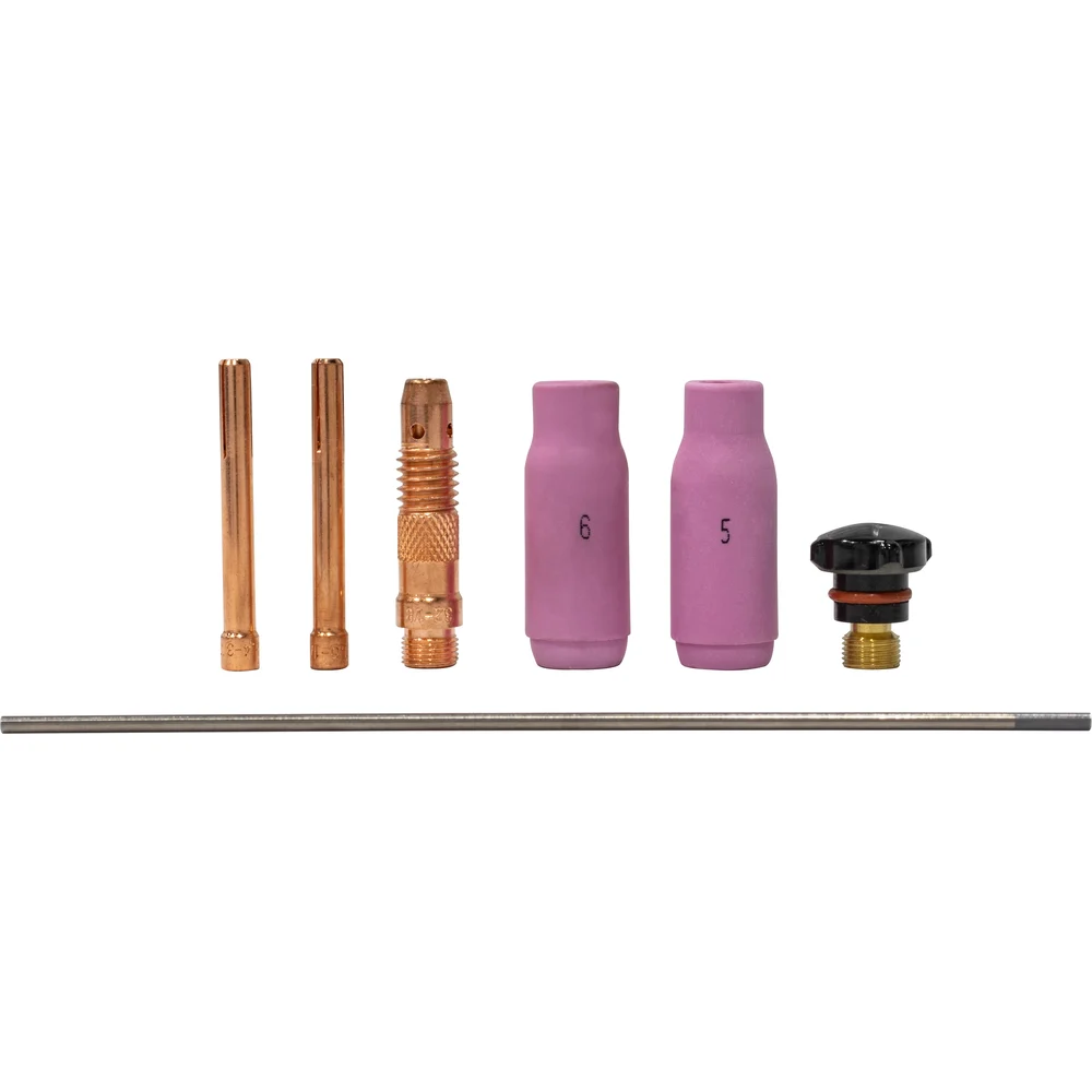Комплектация IRONMAN 400 AC/DC DIGITAL; Газоэлектрический интегрированный соединитель 2 шт; Хомуты 6-12, 2 шт; Зажим массы 300А с кабелем 35мм2*3м; горелка TIG18/водное охл./4м/10мм2 с аксессуарами; Вольфрамовый электрод диаметр 2.4мм длина 150мм