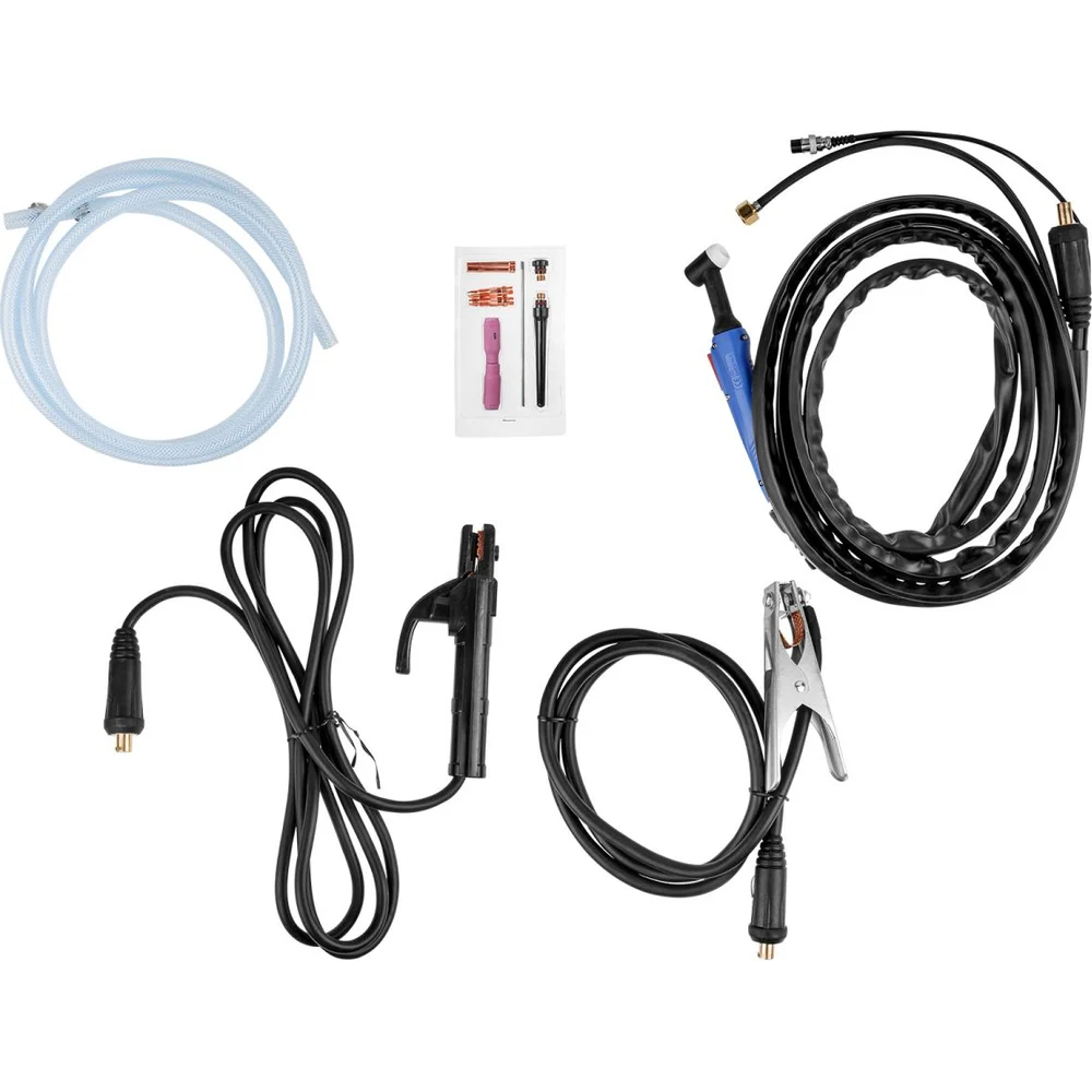 Комплектация Источник сварочного тока; Сварочная горелка серии WP-26 (4 метра); Керамические сопла - 2 шт; Цанги - 2 шт. (1,6 мм и 2,4 мм); Цанговый патрон - 2 шт. (1,6 мм и 2,4 мм); Короткий колпачок; Длинный колпачок; Два вольфрамовых электрода (1,6 мм и 2,4 мм); Заземляющий зажим с кабелем (2 метра); Электрододержатель с кабелем (3 метра); Газовый шланг (2 метра) и два зажима; Инструкция по эксплуатации
