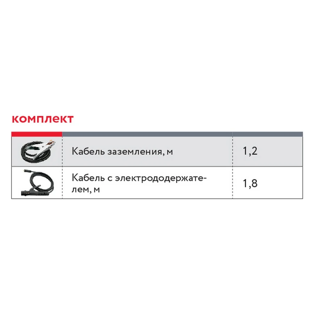 Комплектация Сварочный инвертор; Кабель с электрододержателем 1,8 м; Кабель заземления 1,2 м; Инструкция