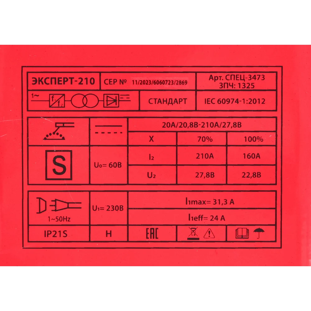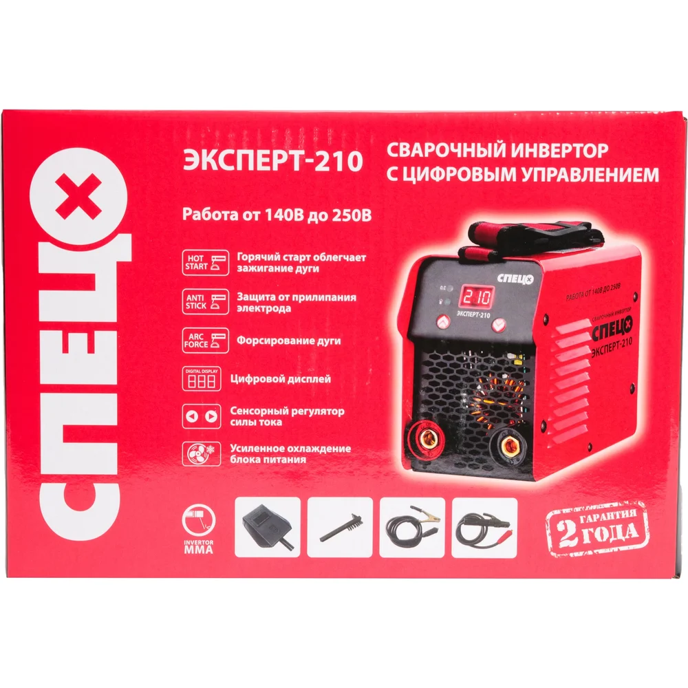 Инвертор сварочный Спец ЭКСПЕРТ-210,дисплей, сенсорное управление, 1*230В, 20-210А,электр.1,6-5мм (акс.в компл.+щиток сварщика+щетка-молоток) СПЕЦ-3473