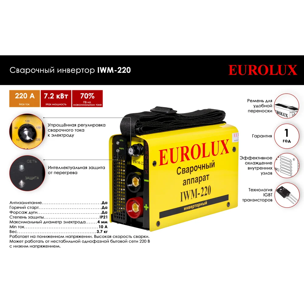 Купить Инверторный сварочный аппарат Eurolux IWM220 65/28 по лучшей цене с доставкой - интернет магазин №1 в России
