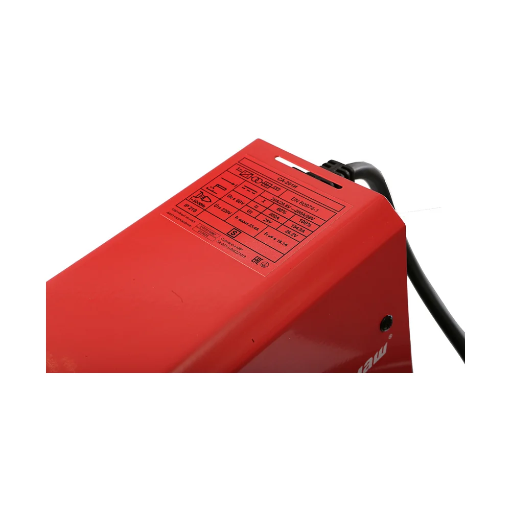 Комплектация Сварочный аппарат; Сварочный кабель с держателем электрода; Сварочный кабель с зажимом заземления; Щетка-молоток; Плечевой ремень (установлен); Инструкция по эксплуатации; Инструкция по безопасности