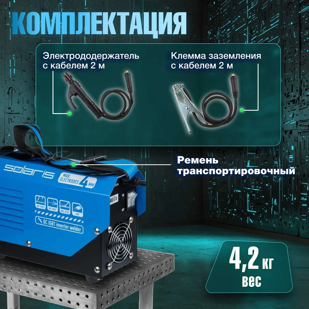 Комплектация Сварочный аппарат; Электрододержатель с кабелем 2 метра; Клемма заземления с кабелем 2 метра; Ремень транспортировочный; Инструкция; Коробка