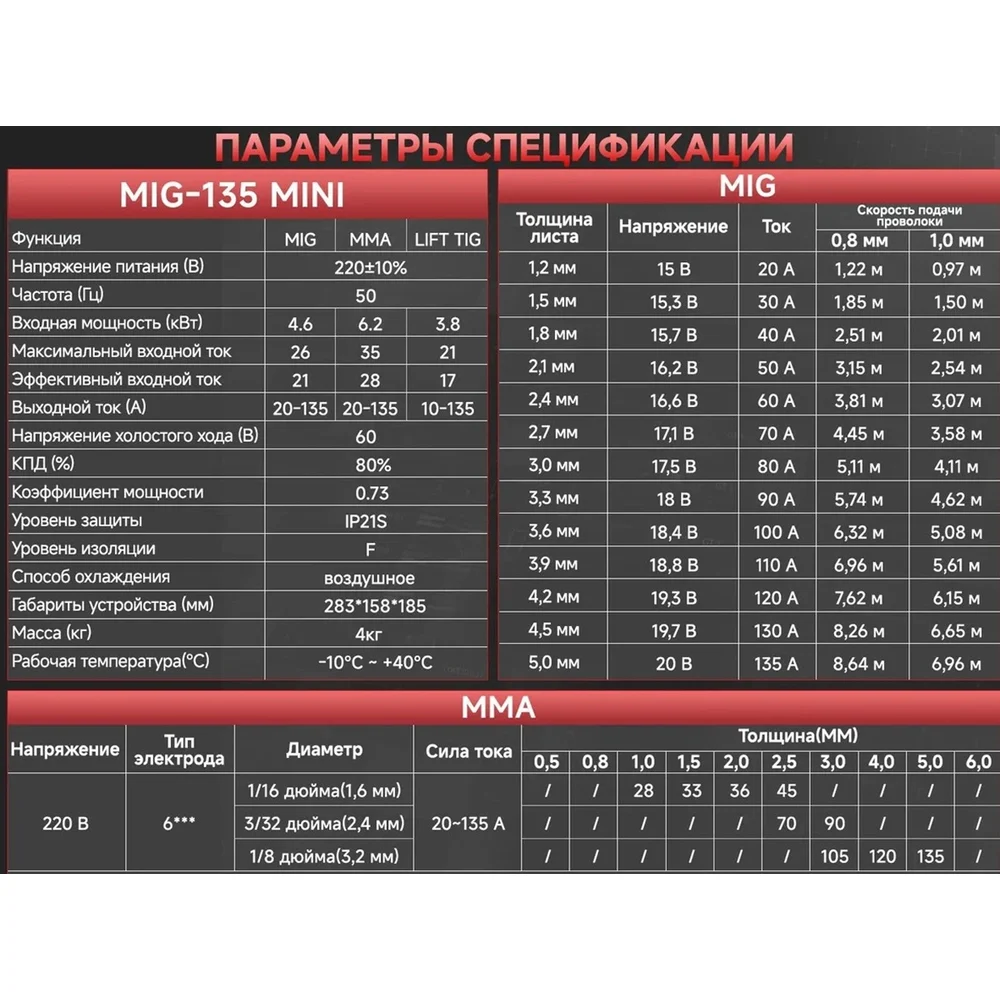 Комплектация Инвертор сварочный полуавтоматический; ANDELI; MIG-135MINI; MIG(без газа)/Lift; TIG/MMA артикул; ADL20-214