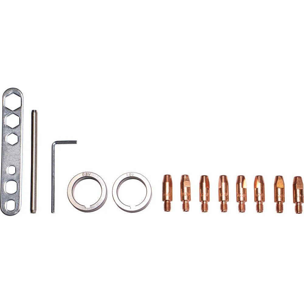 Комплектация Горелка SN24 с поворотным гусаком, 25мм2, 3м; Тефлоновый канал для работы с Al, 3м; Комплект роликов подачи с U-образной канавкой для работы с алюминием 1.0-1.2мм; Наконечники для работы с алюминием 1.0мм, 1.2мм; Канал для стальной проволоки, 3м; Комплект роликов подачи с V-образной канавкой для работы со стальной проволокой 0.8-1.0мм; Наконечники для работы со стальной проволокой 0.8мм, 1.0мм; Зажим на массу 300А + кабель 25мм2, 3м; Держатель электрода + кабель 25мм2, 3м; Газовый рукав (с комплектом хомутов) 8*12мм, 3м