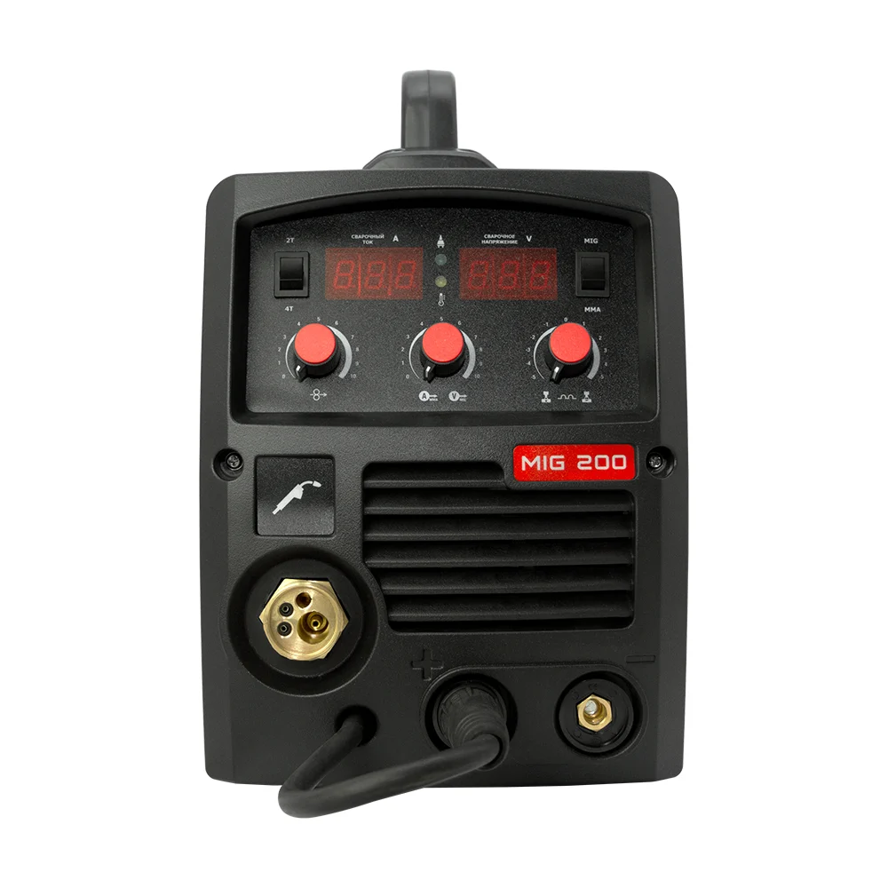 Комплектация Полуавтомат с сетевым кабелем – 1 шт; Зажим для заземления 200 А с кабелем – 1 шт; Электрододержатель 200 А с кабелем – 1 шт; Горелка для полуавтоматической сварки - 1 шт; Хомут для газового шланга - 2 шт; Комплект ЗИП для горелки MIG – 1 шт; Инструкция – 1 шт; Гарантийный талон – 1 шт