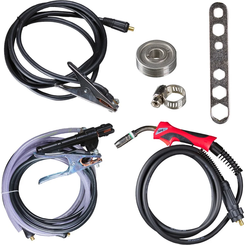 Комплектация горелка (250 А, 3 м),; кабель заземления (25 мм2 х 3 м),; кабель с электрододержателем (1,6 м),; газовый шланг (3 м); сварочный полуавтомат