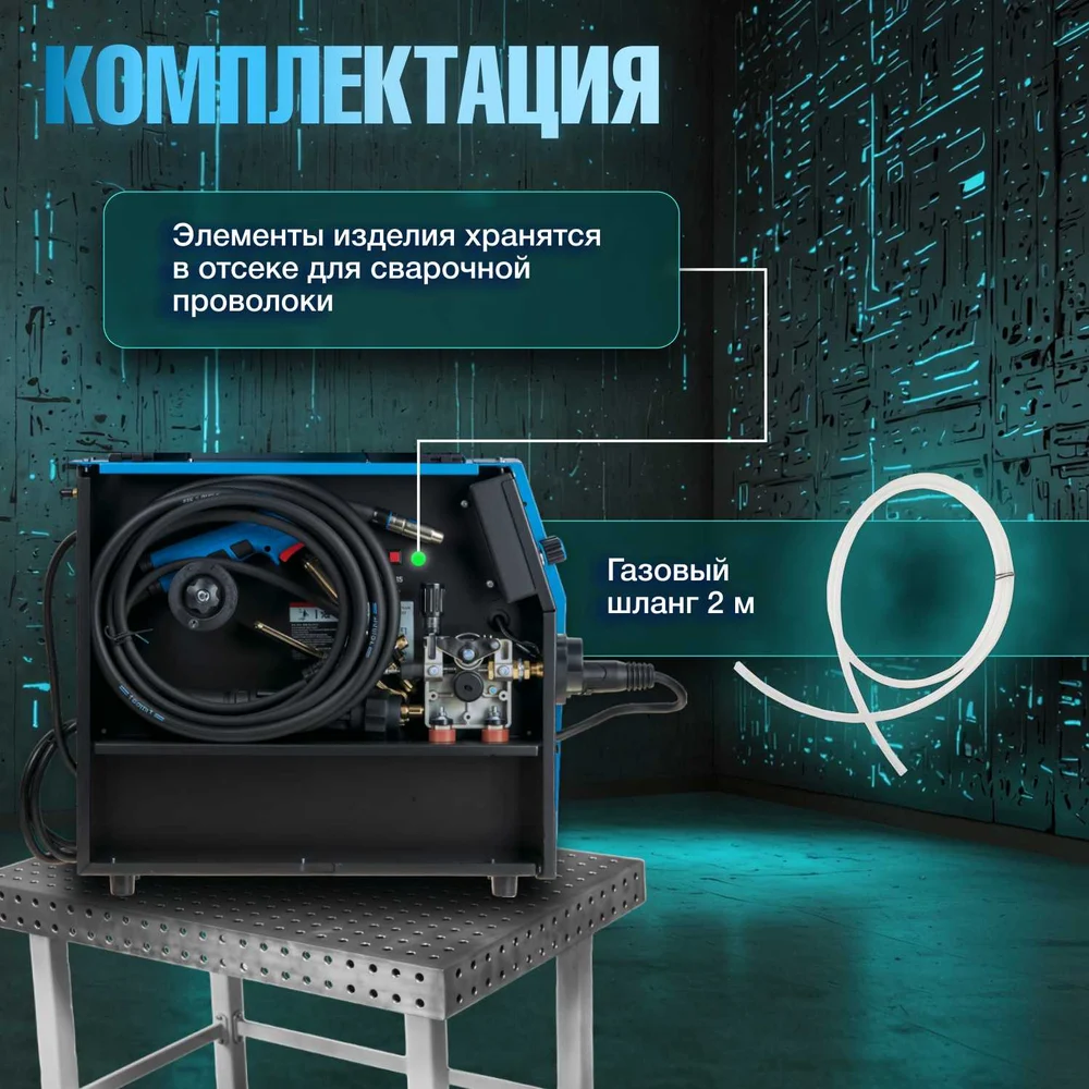 Комплектация Горелка MIG15 3м,; Кабель,; Зажим на массу 300А,; Газ. шланг,; Ролик,; Эл-держатель