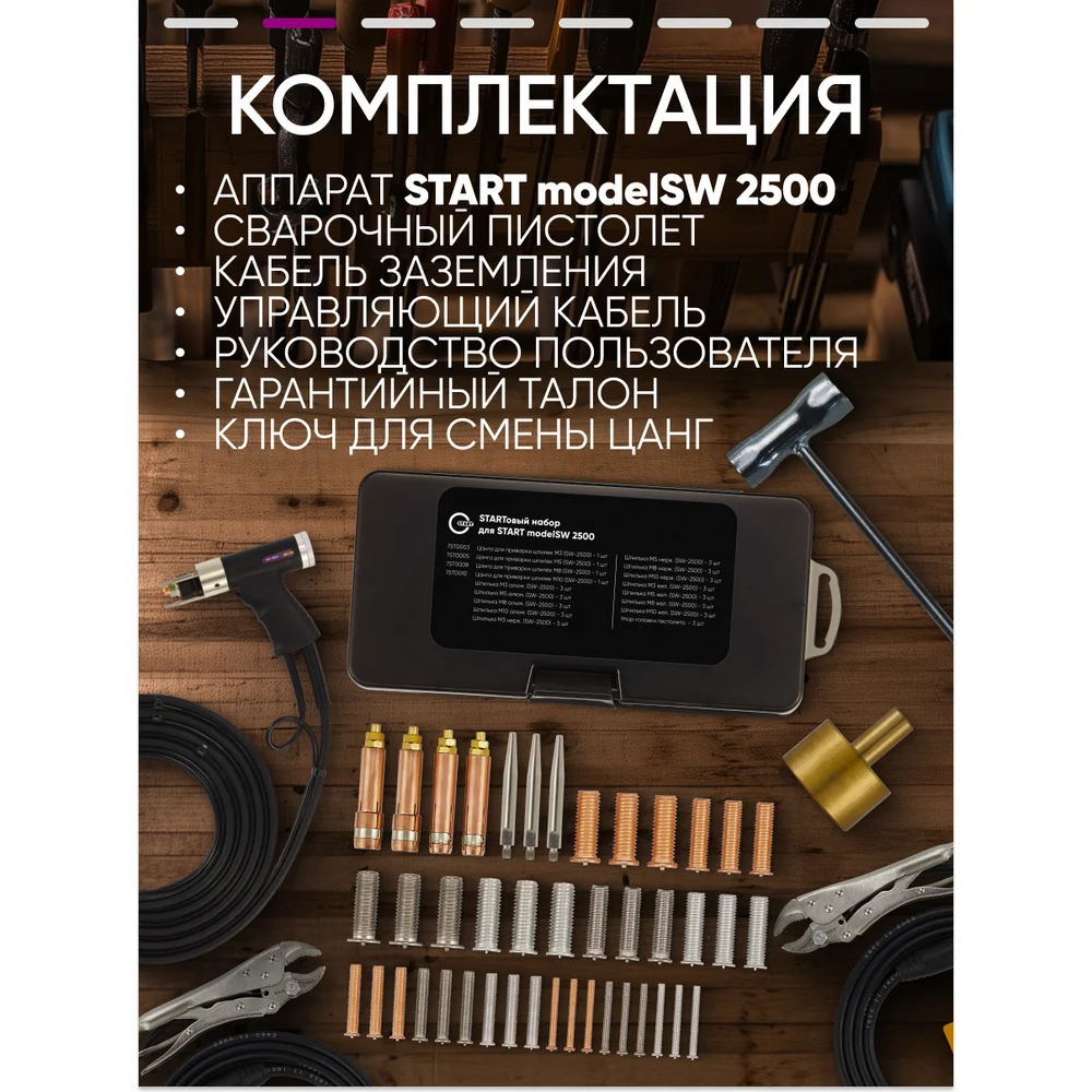 Комплектация Аппарат; Сварочный пистолет; Кабель заземления медный 16 мм; Насадка для сварки гвоздей; Руководство пользователя; Гарантийный талон; STARTовый набор modelSW:; Цанга M3 - 1 шт; Цанга M5- 1 шт; Цанга M8 - 1 шт; Цанга M10- 1 шт; Шпилька M3 алюм.-3 шт; Шпилька M5 алюм.-3 шт; Шпилька M8 алюм.-3 шт; Шпилька M10 алюм.-3 шт; Шпилька M3 нерж.-3 шт; Шпилька M5 нерж.-3 шт; Шпилька M8 нерж.-3 шт; Шпилька M10 нерж.-3 шт; Шпилька M3 сталь-3 шт; Шпилька M5 сталь-3 шт; Шпилька M8 сталь-3 шт; Шпилька M10 сталь-3 шт; Упор головки пистолета - 3 шт