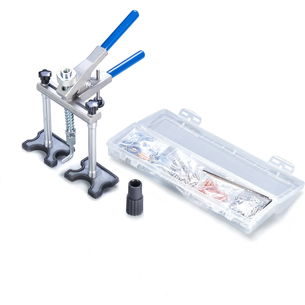 Комплектация Цанга под шпильку М4 – 1шт; Цанга под шпильку М5 – 1шт; Цанга под шпильку М6 – 1шт; Алюминиевая шпилька М4 – 50шт; Алюминиевая шпилька М5 – 50шт; Алюминиевая шпилька М6 – 50шт; Омедненная шпилька М4 – 50шт; Овальная шайба с резьбой под шпильку М4 – 6шт; Овальная шайба с резьбой под шпильку М5 – 6шт; Овальная шайба с резьбой под шпильку М6 – 6шт; Быстросъемный вытяжной механизм с двумя упорами – 1шт; Инструкция