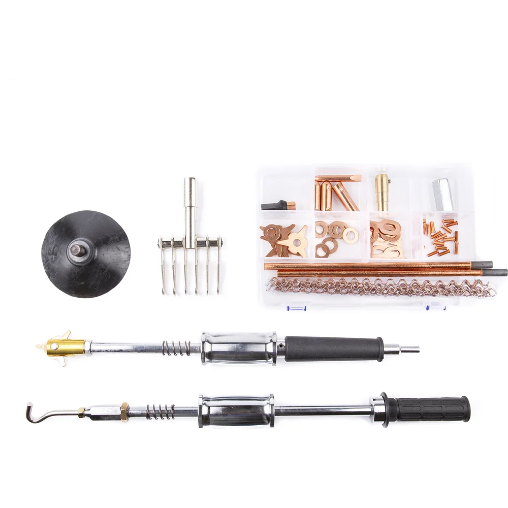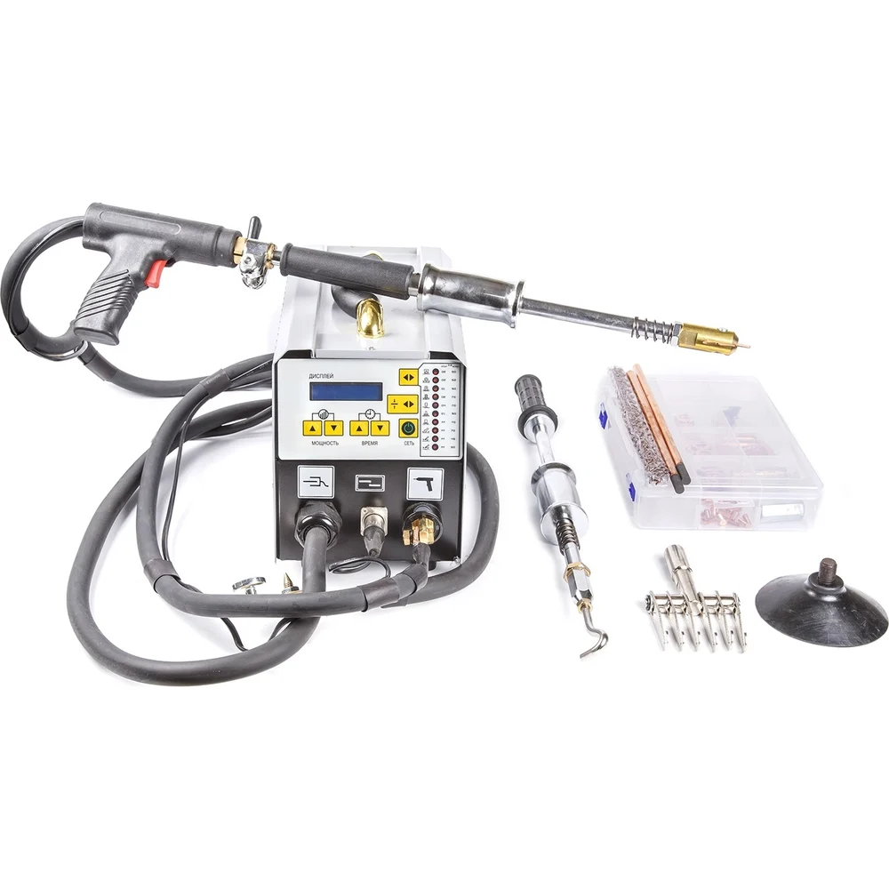 Комплектация Споттер; Комплект расходников (наконечники для сварки, волнистая проволока, треугольники, шайбы); Угольные электроды; Сварочный пистолет; Обратный молоток к сварочному пистолету; Обратный молоток с крючком; Гребенка с шестью крючками; Присоска к обратному молотку