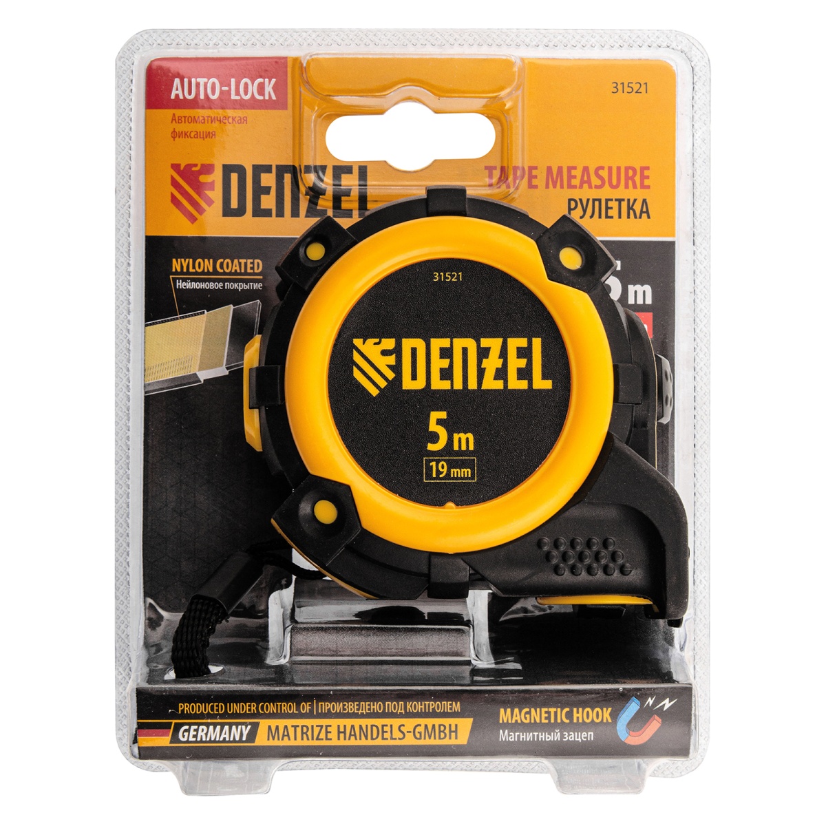 Купить Рулетка 5м х 19мм, автоматич. фиксац., нейлон. покрытие, магнит. зацеп, двухстор. разметка Denzel V6031 по лучшей цене с доставкой - интернет магазин №1 в России