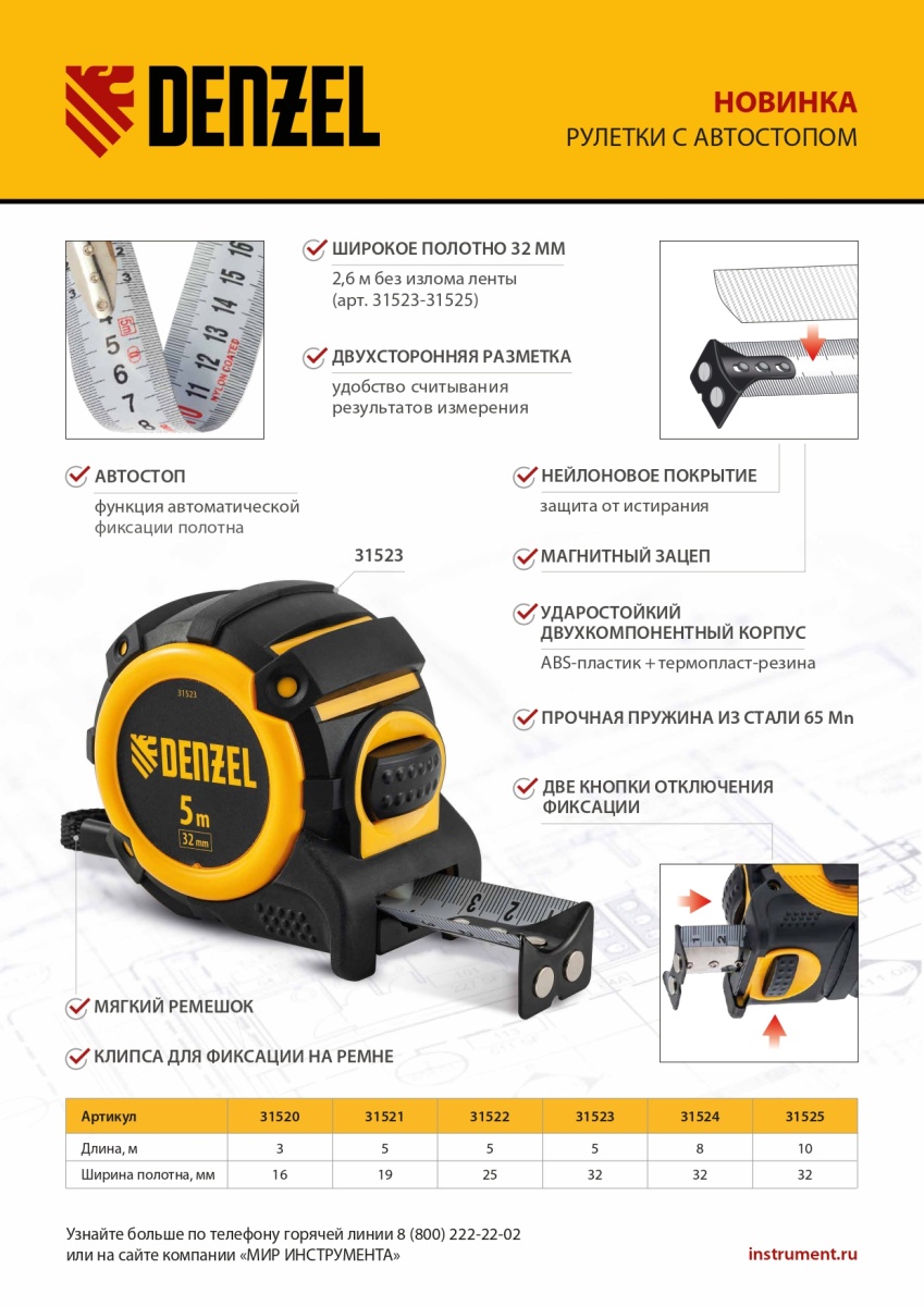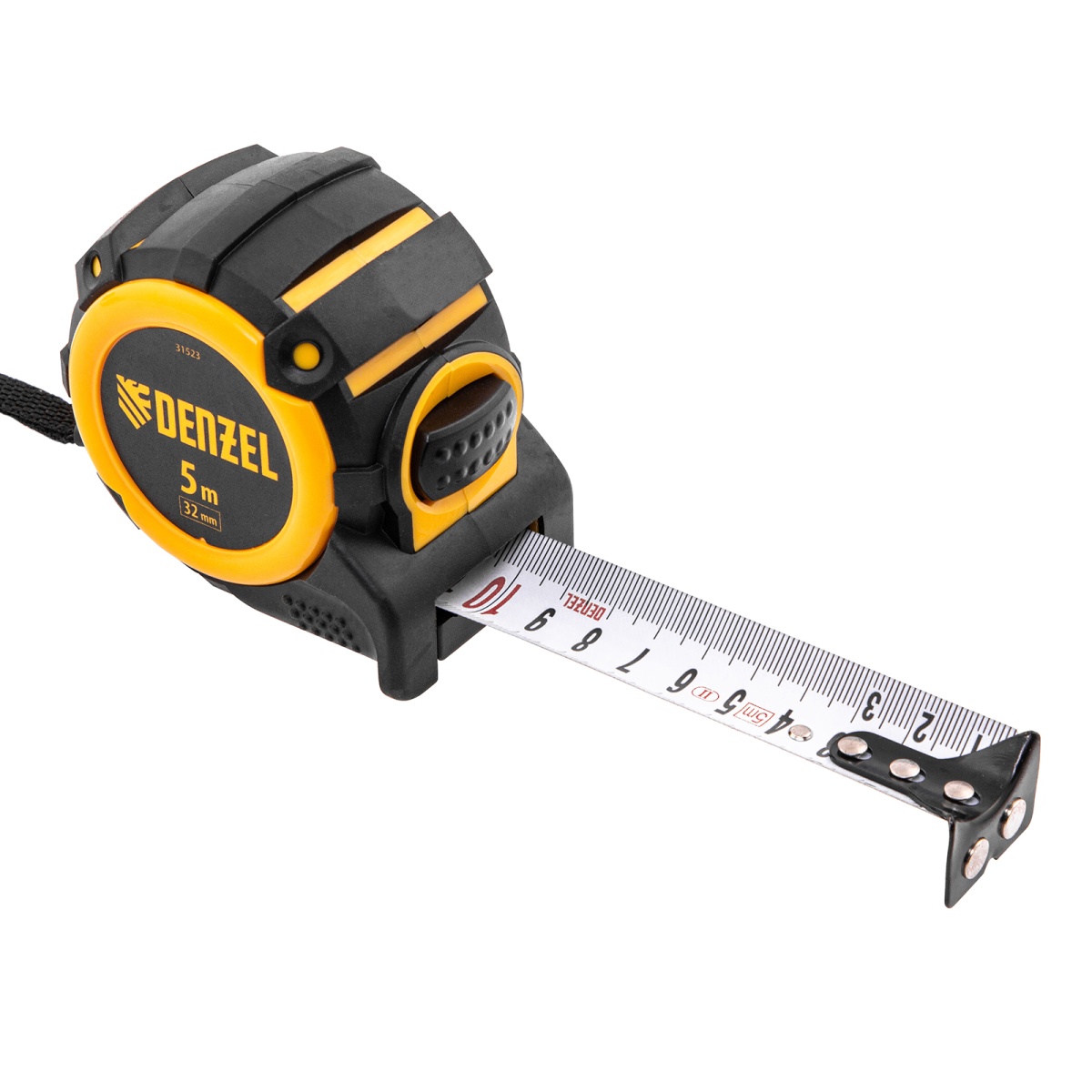 Купить Рулетка 5м х 32мм, автоматич. фиксац., нейлон. покрытие, магнит. зацеп, двухстор. разметка Denzel V6038 по лучшей цене с доставкой - интернет магазин №1 в России