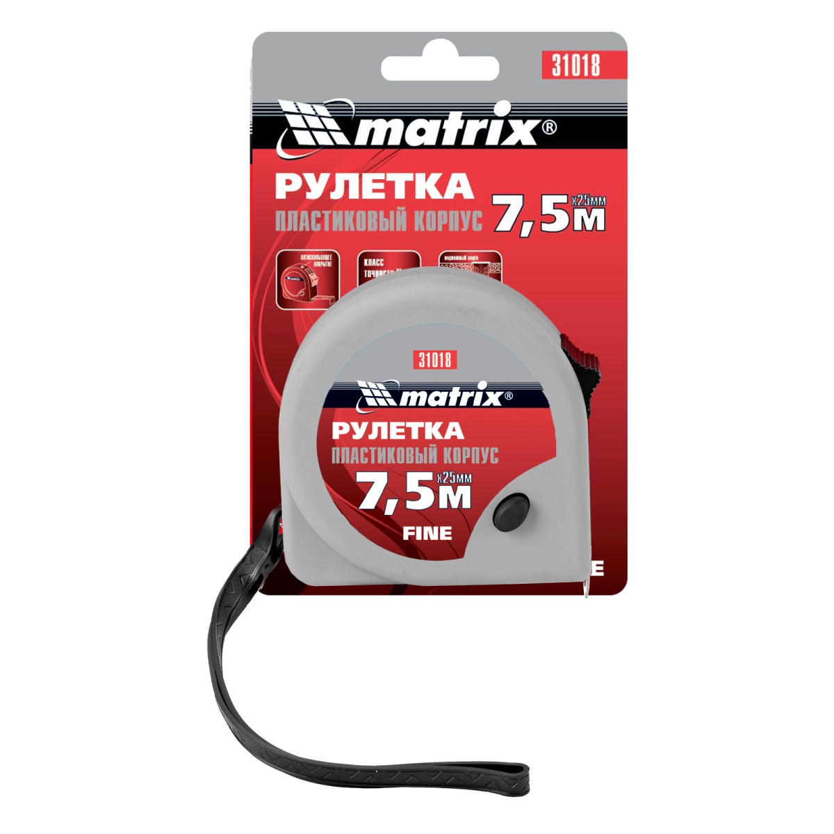 Наличие клапана для сброса давления Рулетка Fine,7,5 м х 25 мм,пластиковый корпус Matrix