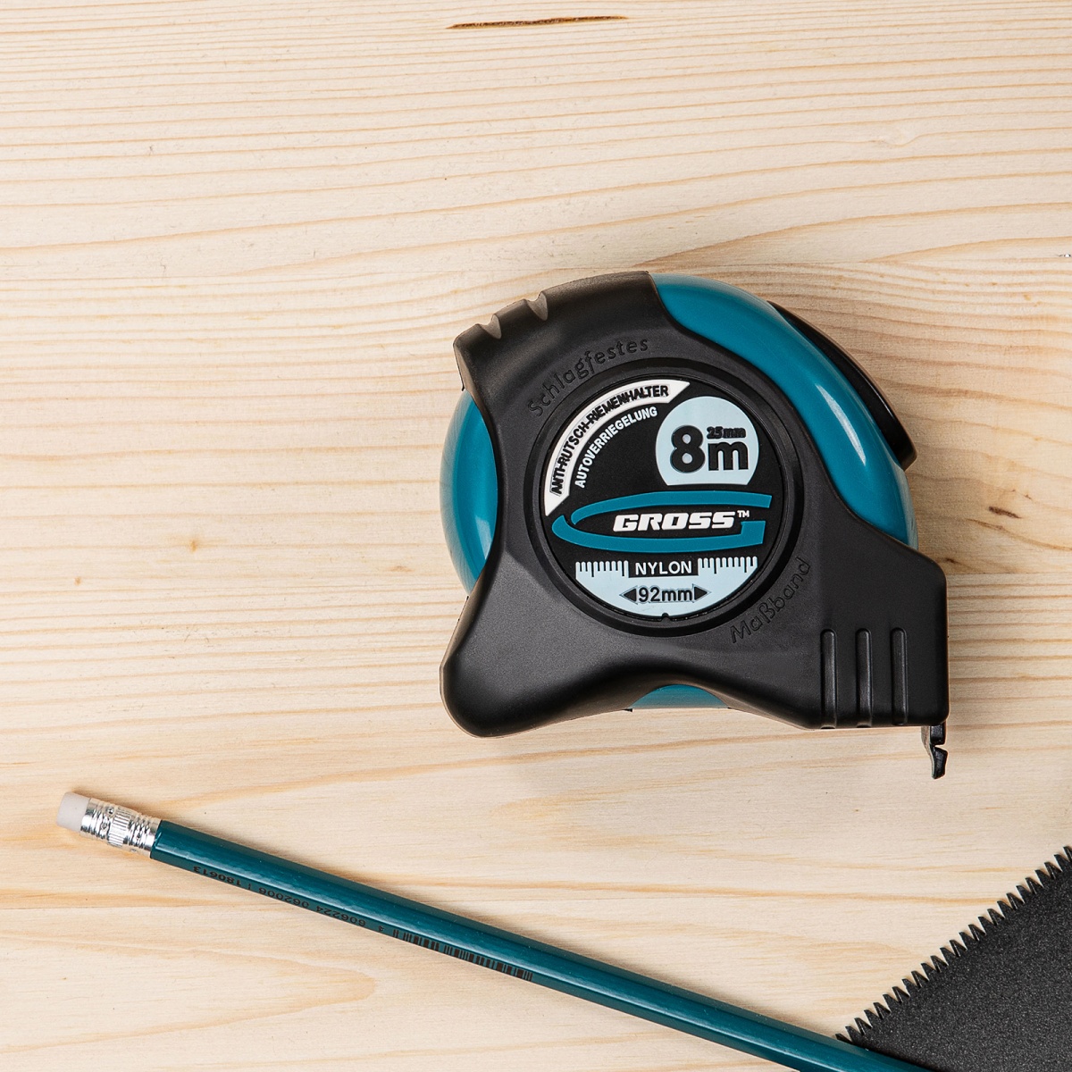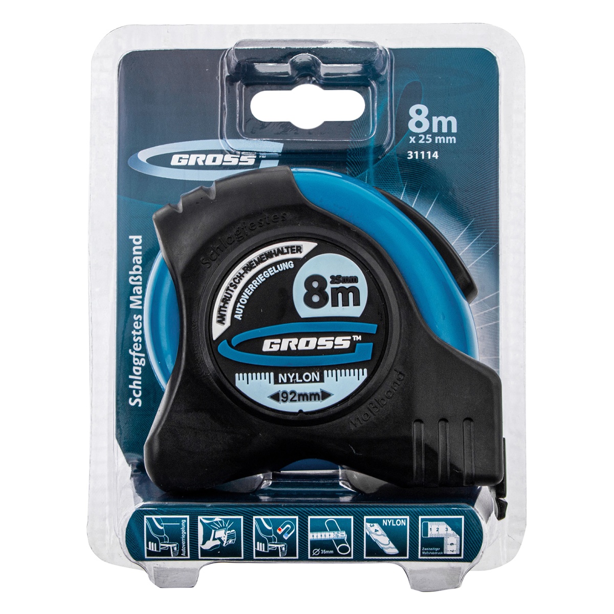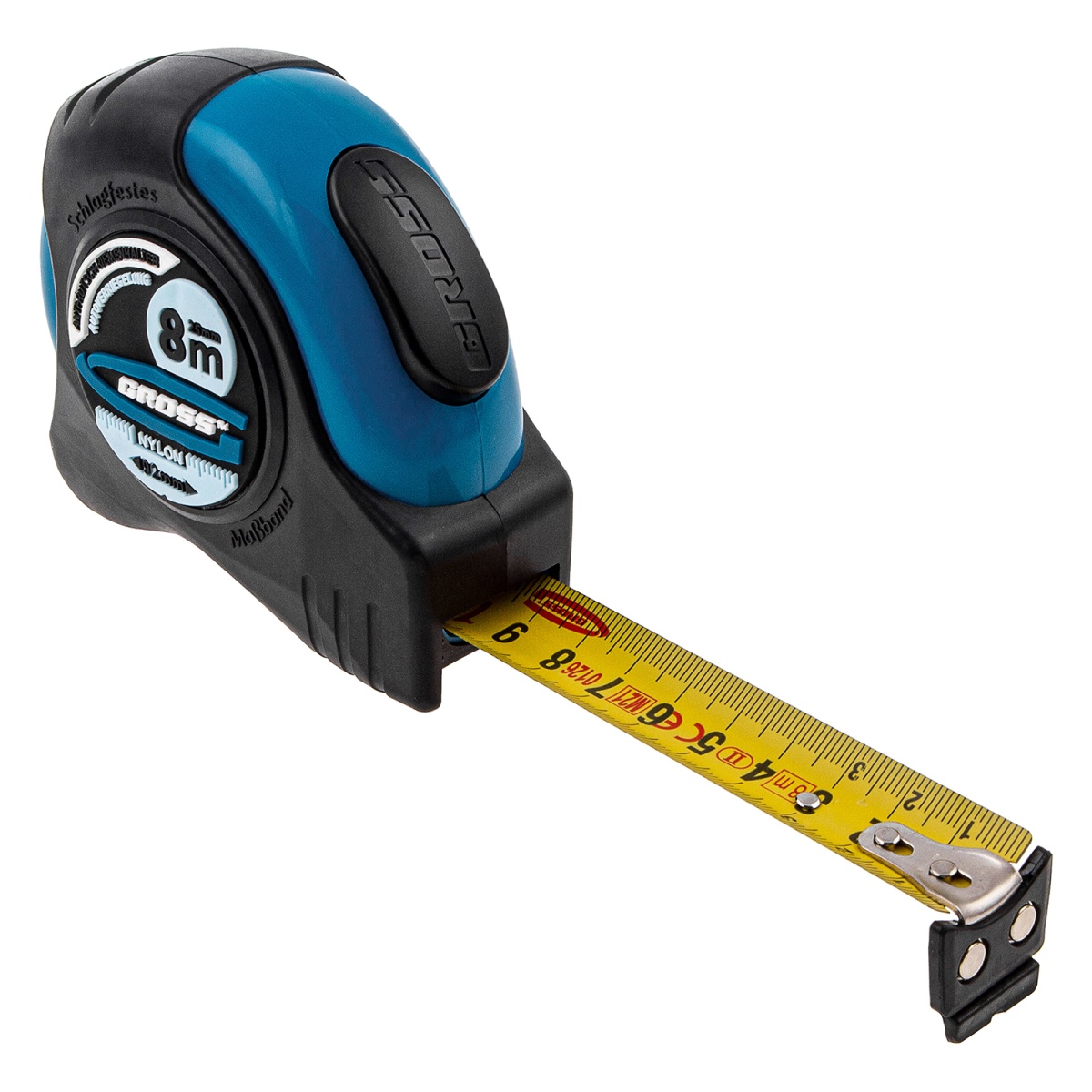 Рулетка "Schlagfest",8 м x 25 мм,магнитный обрезиненный зацеп,двусторонняя шкала,Нейлоновое покрытие,автоматическая фиксация Gross
