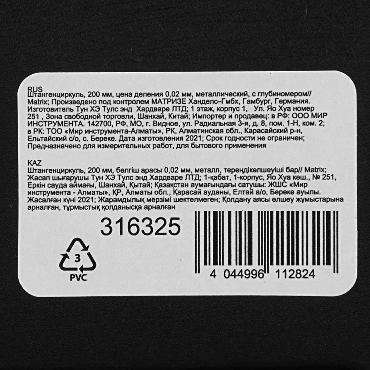 Купить Штангенциркуль, 200 мм, цена деления 0.02 мм, металлический, с глубиномером Matrix V8016 по лучшей цене с доставкой - интернет магазин №1 в России