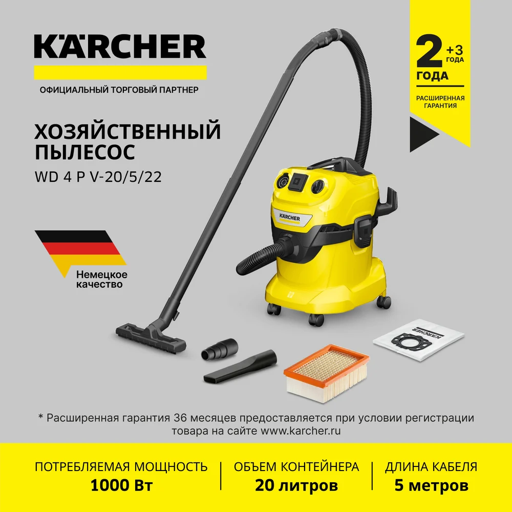 Купить Хозяйственный пылесос Karcher WD 4 P V-20/5/22 EU 1.628-270.0 по лучшей цене с доставкой - интернет магазин №1 в России