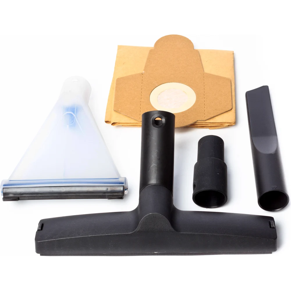 Комплектация Пылесос; Гибкий шланг с трубкой для подачи моющего средства; Транспортировочные колёса - 4шт; Соединительные трубки - 2шт; Щётка для пола; Щелевая насадка; Щётка для подачи и сбора моющего средства; Бумажный мешок; Фильтр из вспенённого полимера; Инструкция; Упаковка