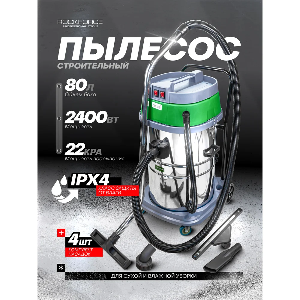 Купить Пылесос для сухой и влажной уборки Rockforce объем бака 80 л, 2400Вт RF-606-2M-80(57829) по лучшей цене с доставкой - интернет магазин №1 в России