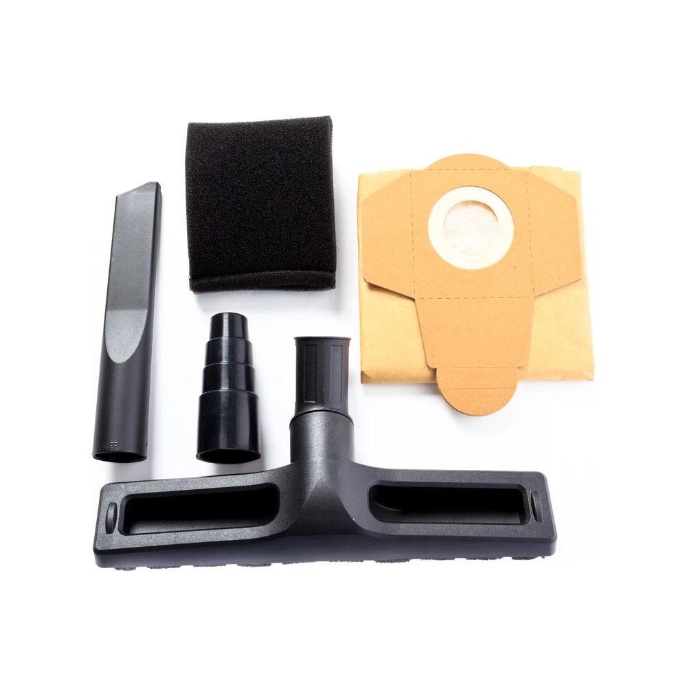 Комплектация Пылесос; Гибкий воздушный шланг; Транспортировочные колёса - 4шт; Соединительные трубки - 2шт; Щётка для пола; Щелевая насадка; Адаптер для пылесоса; Бумажный мешок; Фильтр HEPA; Фильтр из вспенённого полимера; Инструкция; Упаковка