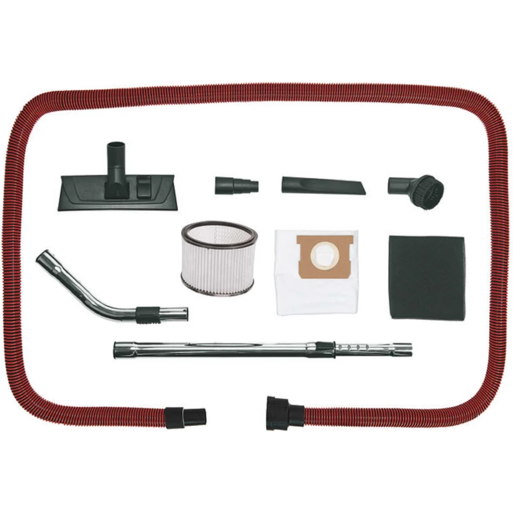 Комплектация Пылесос; Фильтр складчатый для сухого мусора и пыли; Фильтр поролоновый для сбора воды и мокрого шлама; Шланг всасывающий 3 метра; Телескопическая труба из нержавеющей стали; Угловая трубка из нержавеющей стали; Универсальная щётка; Щётка для мебели; Насадка щелевая; Ступенчатый переходник; Мешок для мусора