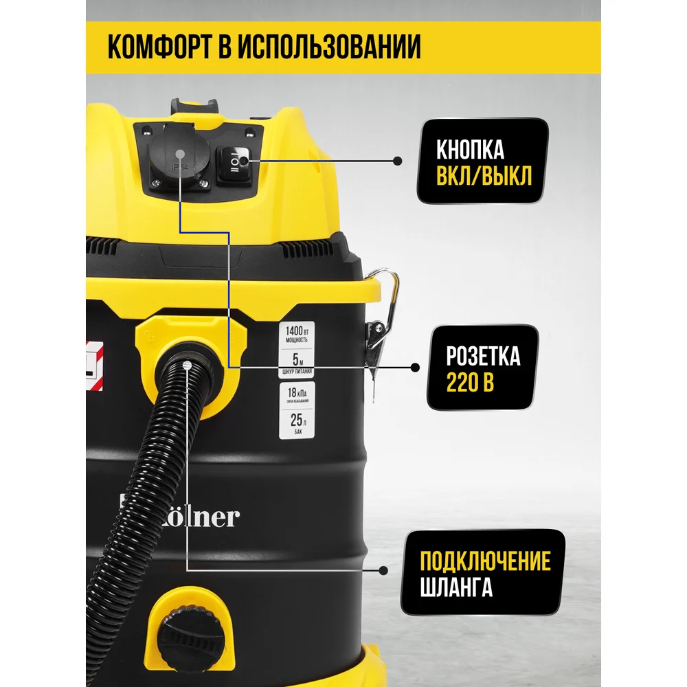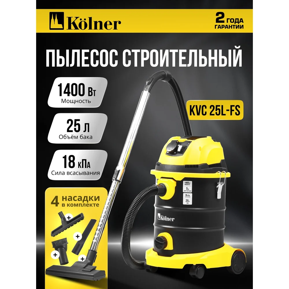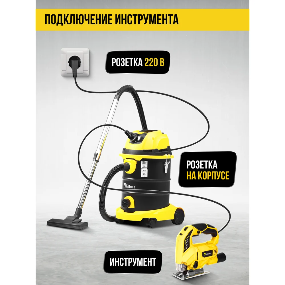 Купить Пылесос строительный Kolner 25л, KVC 25L-FS, 18кПа, 1400Вт, 33л/с 8040400086 по лучшей цене с доставкой - интернет магазин №1 в России
