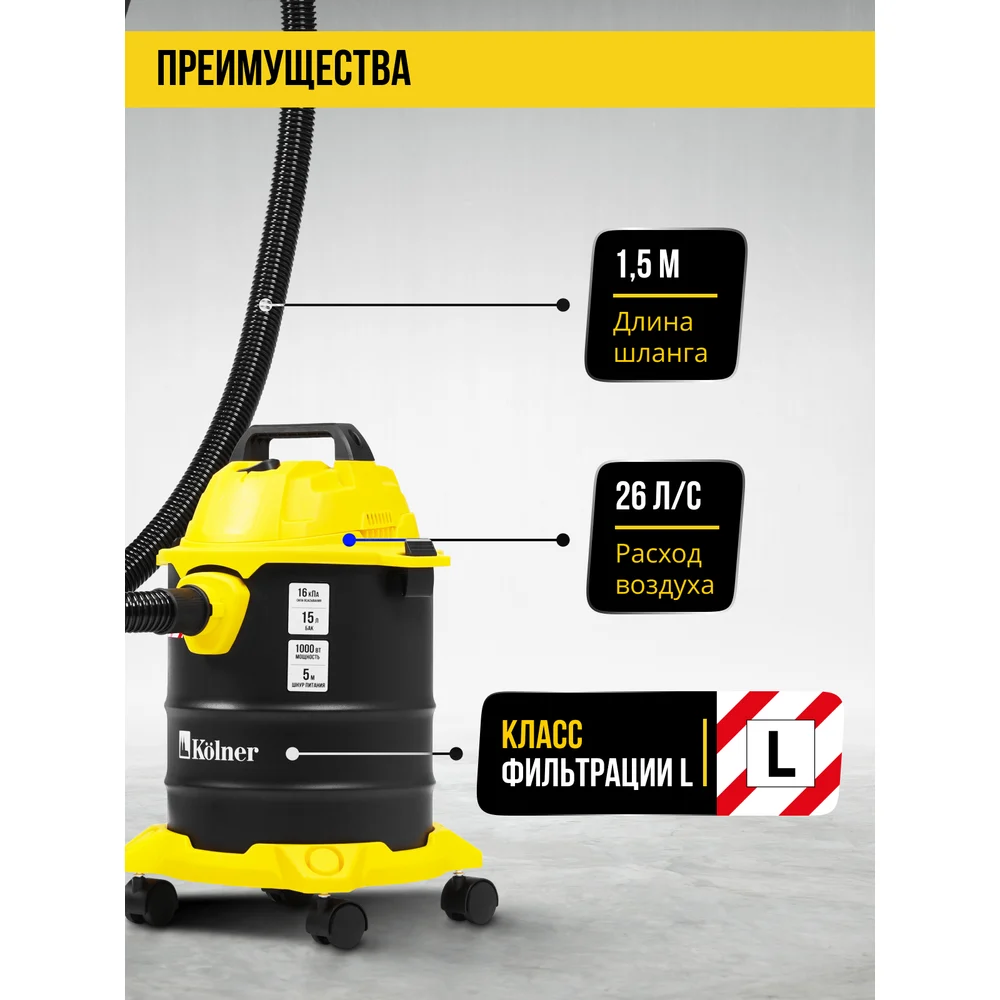 Пылесос строительный Kolner KVC 15L 15л, 16кПа, 1000Вт, 26л/с 8040400066
