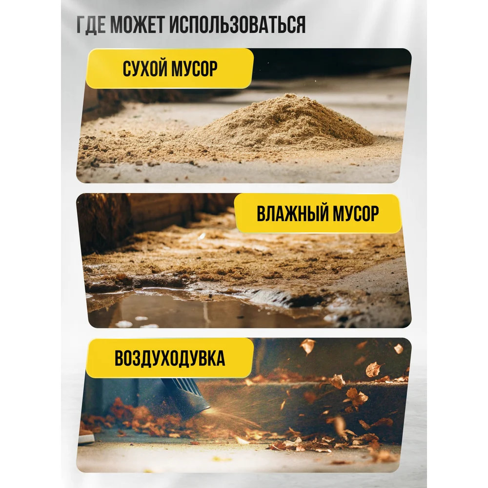 Комплектация Строительный пылесос - 1 шт; Руководство по эксплуатации - 1 шт; Шланг Ø32 мм х 1,5 м - 1 шт; Трубка пластиковая L 930 мм - 3 шт; Губчатый фильтр - 1 шт; Тканевый фильтр - 1 шт; Бумажный мешок для мусора - 1 шт; Щелевая насадка Ø 32 мм х 20 мм - 1 шт; Щетка для сбора сухого / влажного мусора - 1 шт; Насадка 2 в 1 - 1 шт; Адаптер для подключения к инструменту 27-41 мм - 1 шт