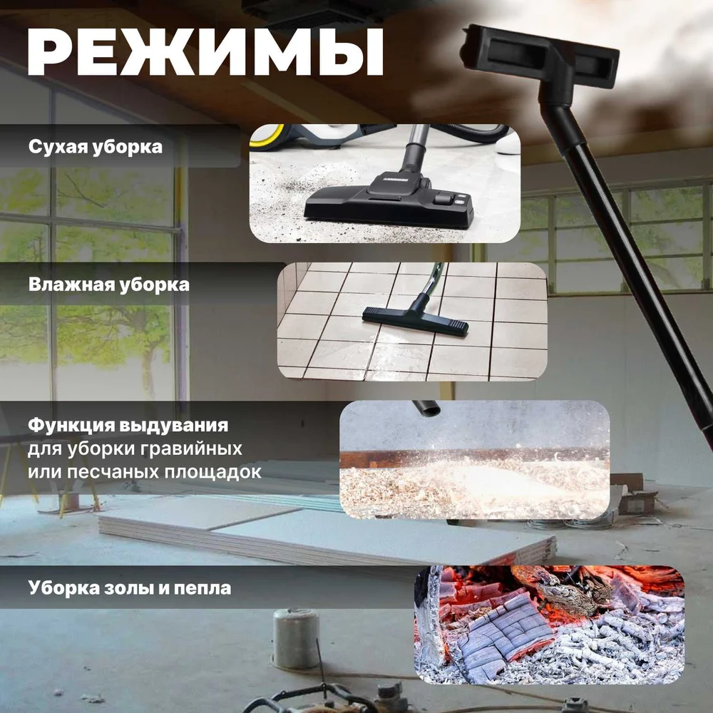 Комплектация Пылесос Металлический шланг 1 м; Алюминиевая трубка; Металлический моющийся фильтр Hepa Щелевая насадка; Круглая щетка; Комбинированная насадка; Колеса с основанием; Соединитель; Трубка PP - 3 шт; Шланг EVA 1,5 м