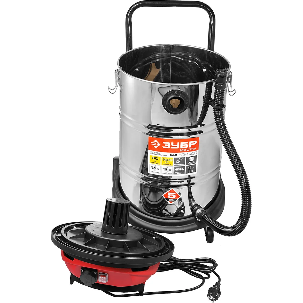 Купить Строительный пылесос ЗУБР МАСТЕР модель М4-60, 60л, 1400Вт, сухая и влажная уборка, корпус из нержавеющей стали, розетка до 2000Вт ПУ-60-1400 М4 по лучшей цене с доставкой - интернет магазин №1 в России