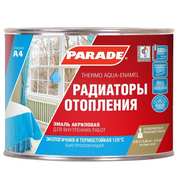 Купить Эмаль акриловая Parade Classic A4 Радиаторы отопления термостойкая полуматовая белая 0,45 л по лучшей цене с доставкой - интернет магазин №1 в России