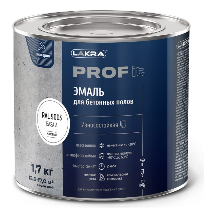 Купить Эмаль для бетонных полов быстросохнущая Лакра Prof it База А RAL 9003 1,7 кг по лучшей цене с доставкой - интернет магазин №1 в России