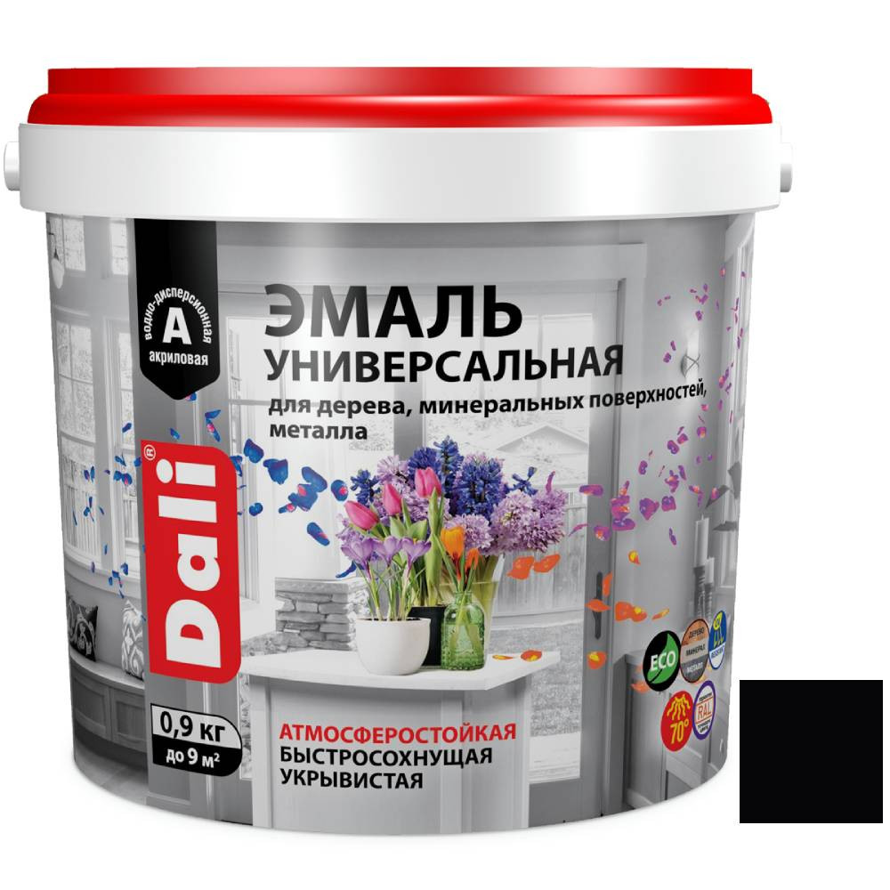 Купить Эмаль универсальная акриловая Dali 80237 атмосферостойкая полуматовая база А черная RAL 9005 0,9 кг по лучшей цене с доставкой - интернет магазин №1 в России