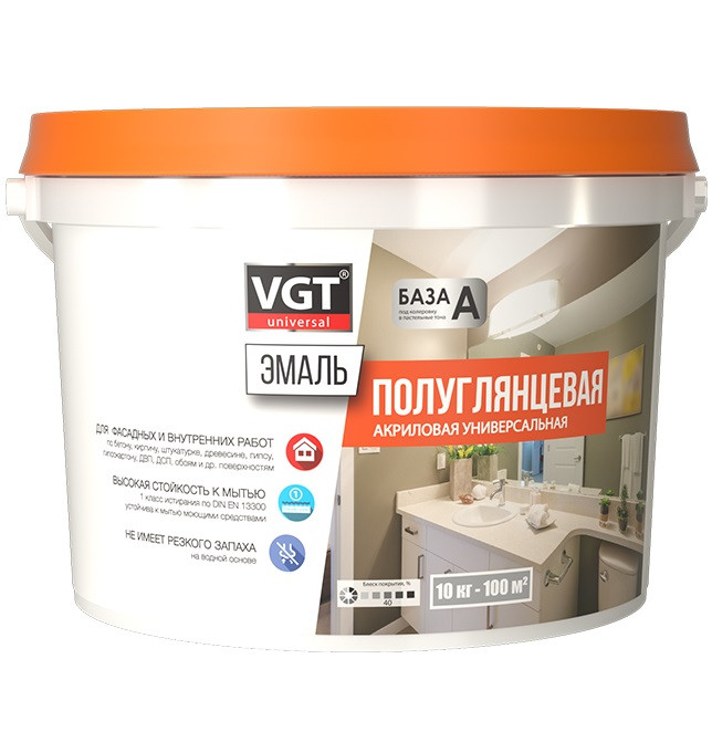 Купить Эмаль универсальная VGT База А полуглянцевая супербелая 10 кг по лучшей цене с доставкой - интернет магазин №1 в России