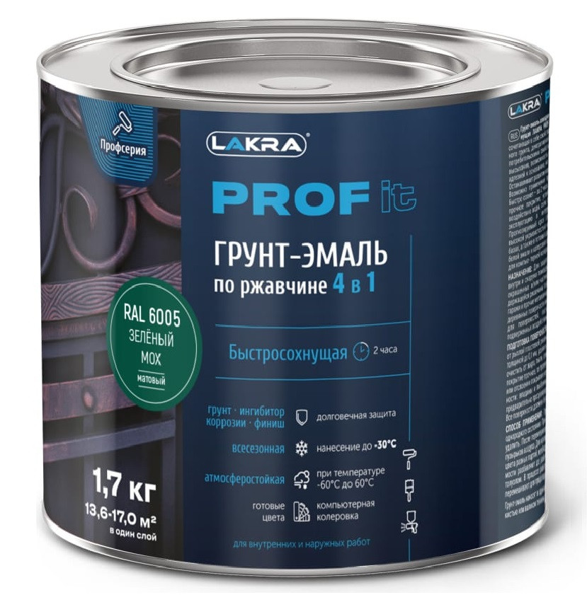 Купить Грунт-эмаль по ржавчине 4 в 1 Лакра Prof it RAL 6005 зеленый мох 1,7 кг по лучшей цене с доставкой - интернет магазин №1 в России