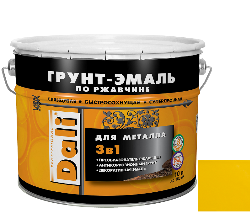 Купить Грунт-эмаль по ржавчине Dali 3 в 1 гладкая RAL 1021 желтая 10 л по лучшей цене с доставкой - интернет магазин №1 в России