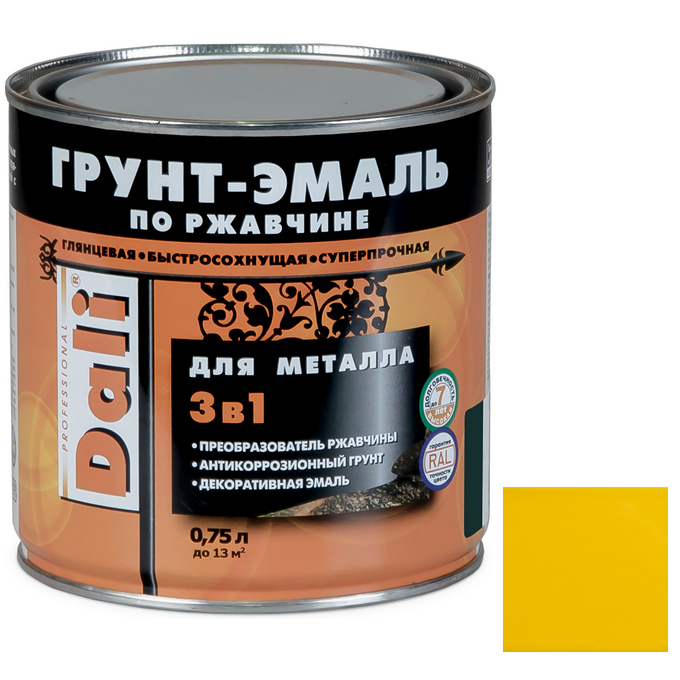 Купить Грунт-эмаль по ржавчине Dali 3 в 1 гладкая желтая RAL 1021 0,75 л по лучшей цене с доставкой - интернет магазин №1 в России