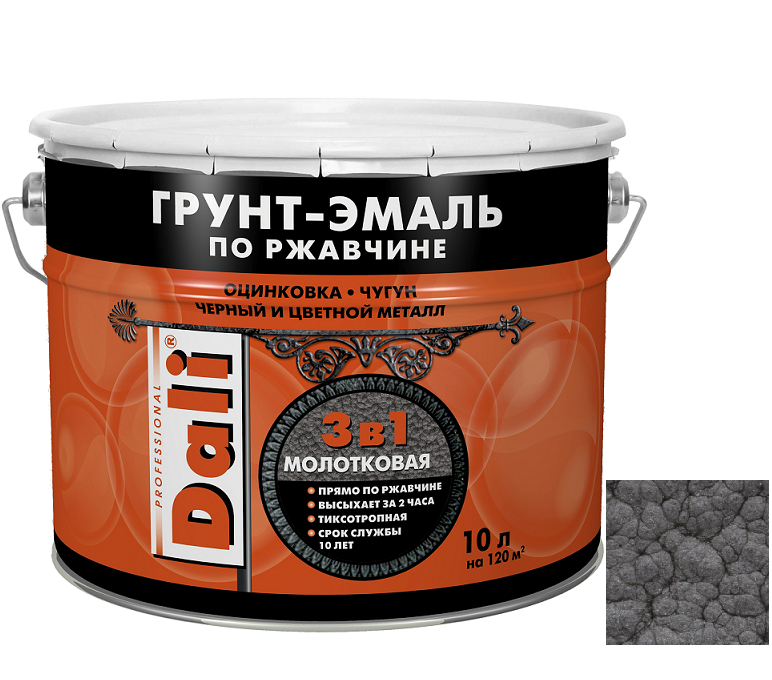 Купить Грунт-эмаль по ржавчине Dali 3 в 1 молотковая серая 10 л по лучшей цене с доставкой - интернет магазин №1 в России
