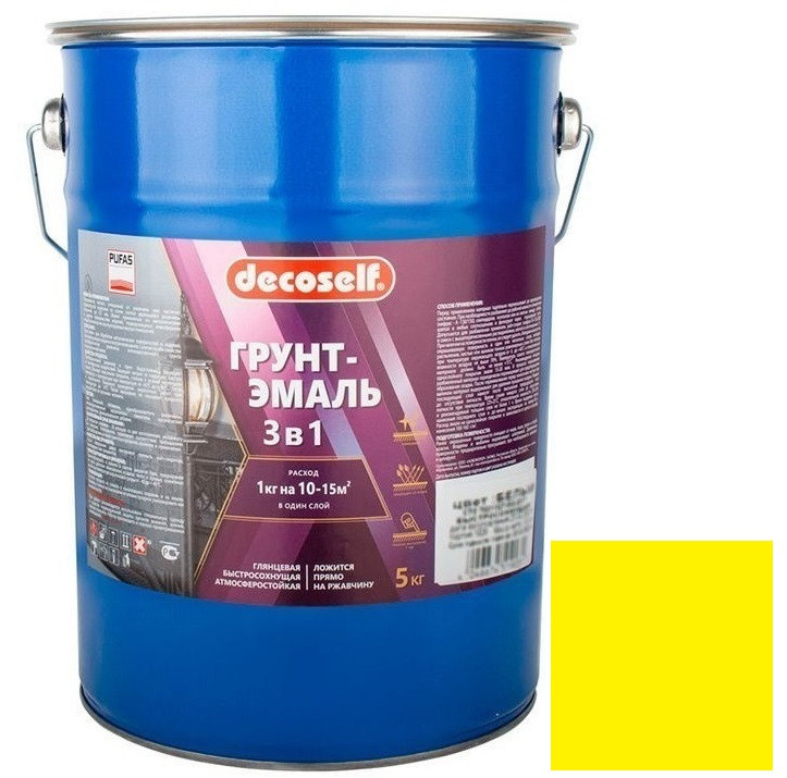Купить Грунт-эмаль Pufas Decoself 3 в 1 глянцевая жёлтая 5 кг по лучшей цене с доставкой - интернет магазин №1 в России