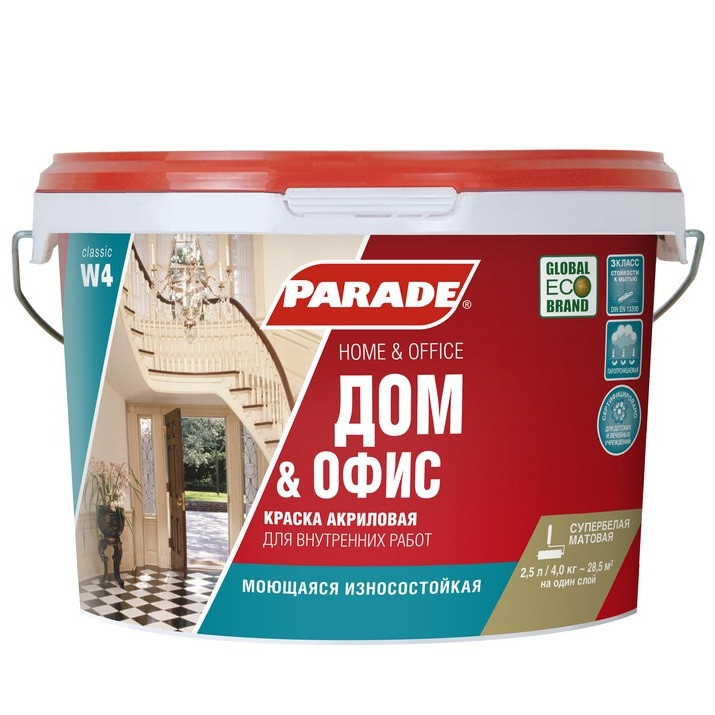 Купить Краска акриловая Parade Classic W4 Дом & Офис интерьерная белая 2,5 л по лучшей цене с доставкой - интернет магазин №1 в России