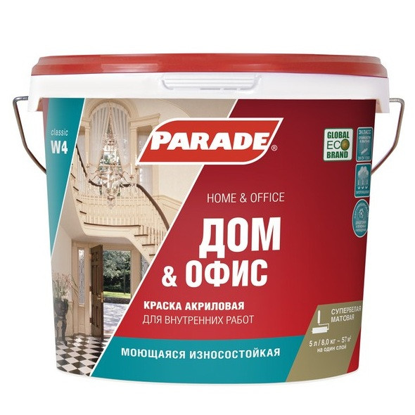 Купить Краска акриловая Parade Classic W4 Дом & Офис интерьерная белая 5 л по лучшей цене с доставкой - интернет магазин №1 в России